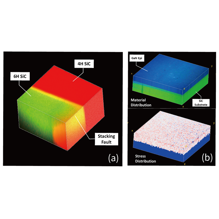 ▪ Effectively reflect the intrinsic property of WBG materials ‒ stress distribution on surface and in depth ▪ Good for monitor the stress distribution and polytype uniformity of SiC substrate, homogeneous and heterogeneous epi wafer, and device process review